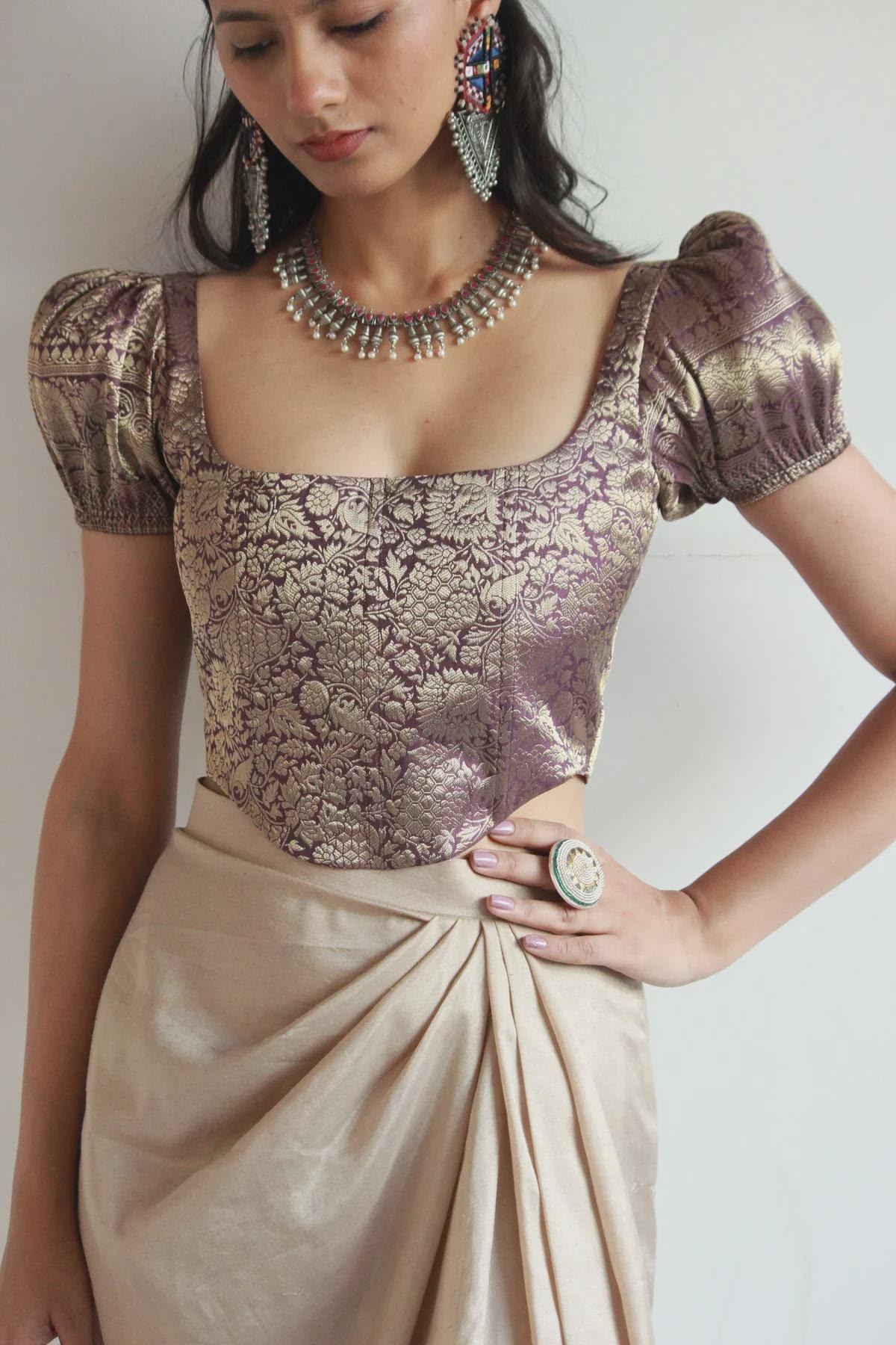 Crop top blouses are perfect for modern ethnic styling. Jacquard fabric adds structure and elegance to this trendy design.
